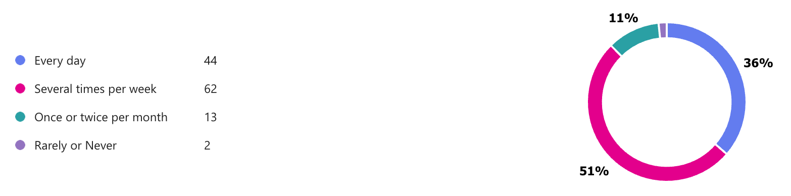 According to your responses, about a third of us read the Bible every day, and the vast majority read at least a couple times per week. Clearly we have room to stretch and grow here. And I'm encouraged by your comments, because several who report not reading very often also expressed a deep desire to study the Scripture more consistently. This points to an opportunity for growth that motivates us Pastors! If this describes you, I recommend getting on board with our 2025 Bible Reading Plan. Just start with today's passage, do it again tomorrow, and repeat!